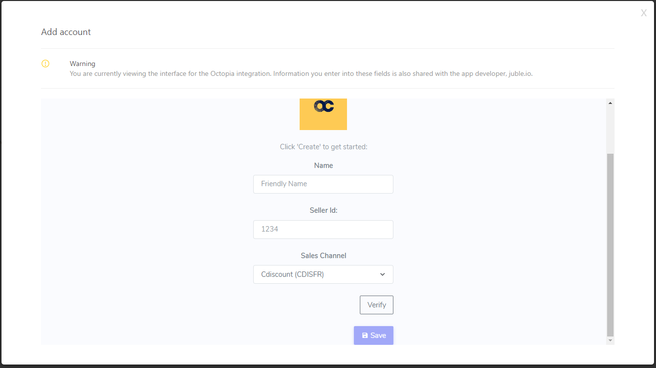 5\. Enter the desired information regarding, the name of the account, the Octopia Seller Id and the Sales Channel