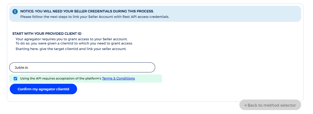 * Click the button labeled **"Confirm my agregator clientId"**.